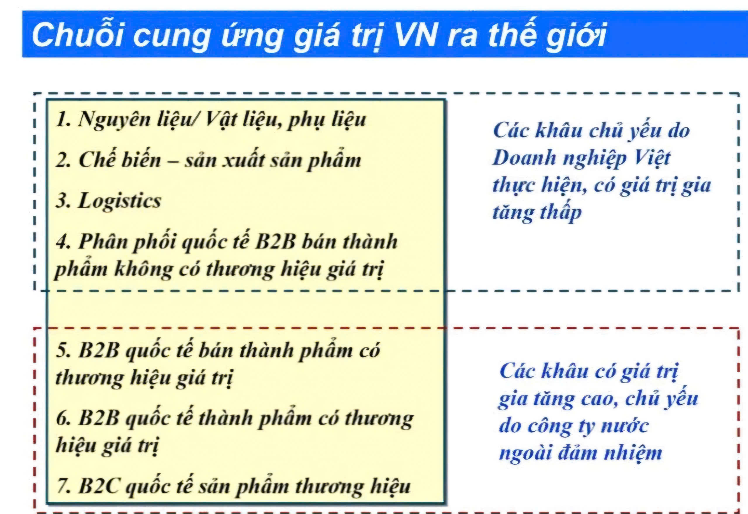 Theo chuyên gia kinh tế Đinh Thế Hiển, điều đáng nói không nằm ở việc doanh nghiệp Việt làm kém, mà ở chỗ đang đứng ở phần giá trị thấp của chuỗi. Các doanh nghiệp trong nước làm rất tốt từ trồng trọt, thu mua, chế biến đến xuất khẩu, nhưng đây lại là những khâu mang lại giá trị gia tăng thấp.