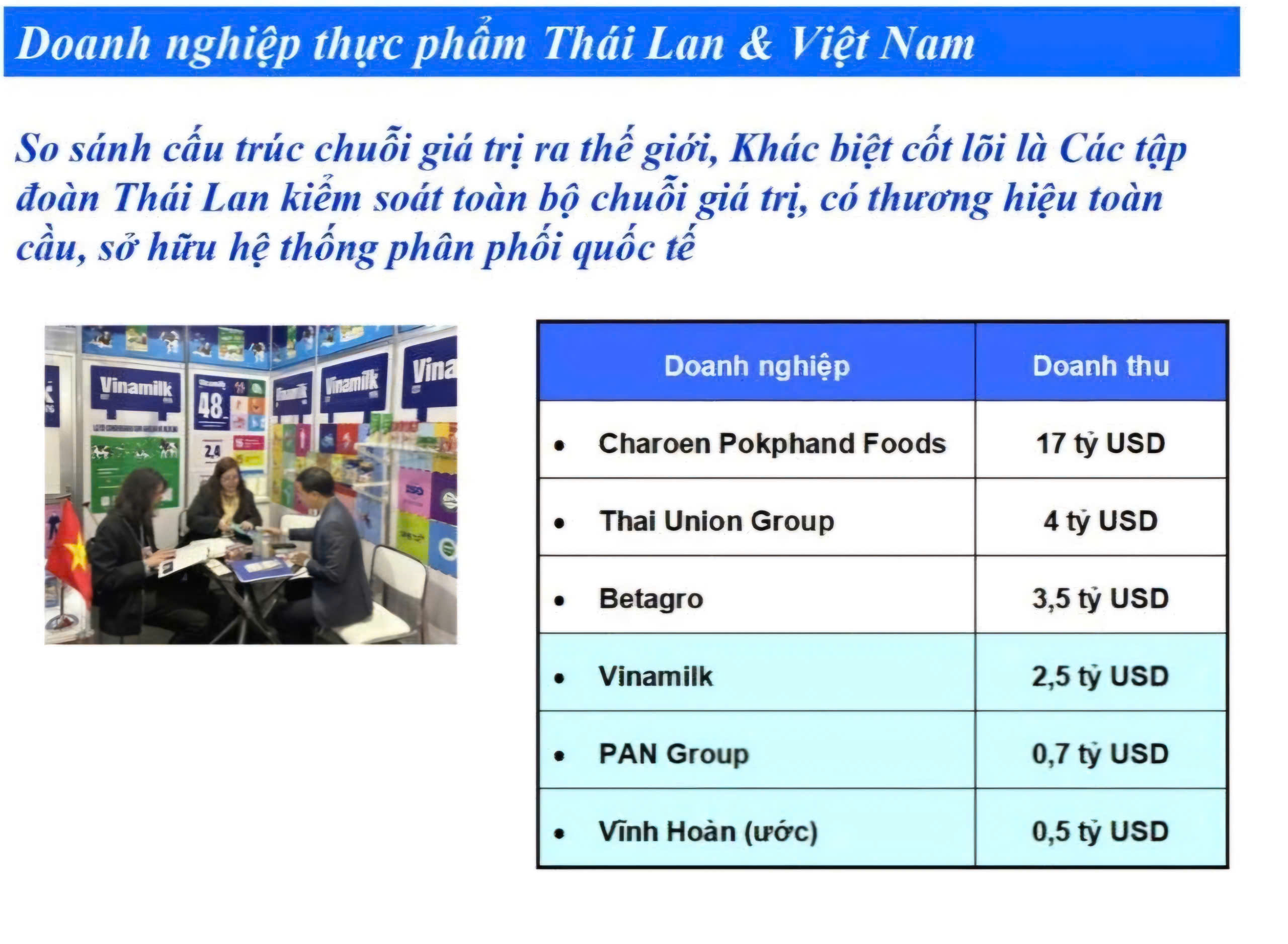 Tuy vậy, các số liệu được chuuyên gia đưa ra cho thấy, các doanh nghiệp Thái Lan có giá trị vượt xa Việt Nam. Có thể kể như Charoen Pokphand Foods đạt khoảng 17 tỷ USD doanh thu, Thai Union Group khoảng 4 tỷ USD, Betagro khoảng 3,5 tỷ USD. Trong khi đó, phía Việt Nam, Vinamilk mới chỉ đạt khoảng 2,5 tỷ USD, PAN Group khoảng 0,7 tỷ USD và Vĩnh Hoàn ở mức khoảng 0,5 tỷ USD.