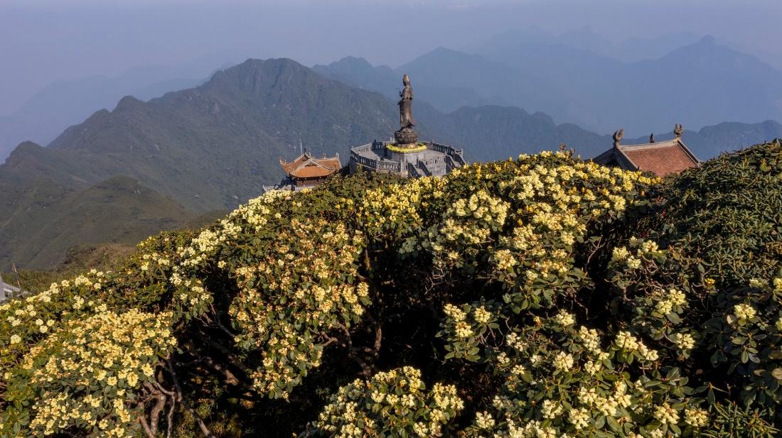 Trên đỉnh núi, những cây Đỗ Quyên cổ thụ hàng trăm năm tuổi đang bung nở, tô điểm cho các vách đá rêu phong và là bối cảnh lý tưởng tôn lên vẻ uy nghiêm, kỳ vĩ của quần thể kiến trúc tâm linh trên đỉnh như Kim Sơn Bảo Thắng Tự hay Đại Tượng Phật A Di Đà.
