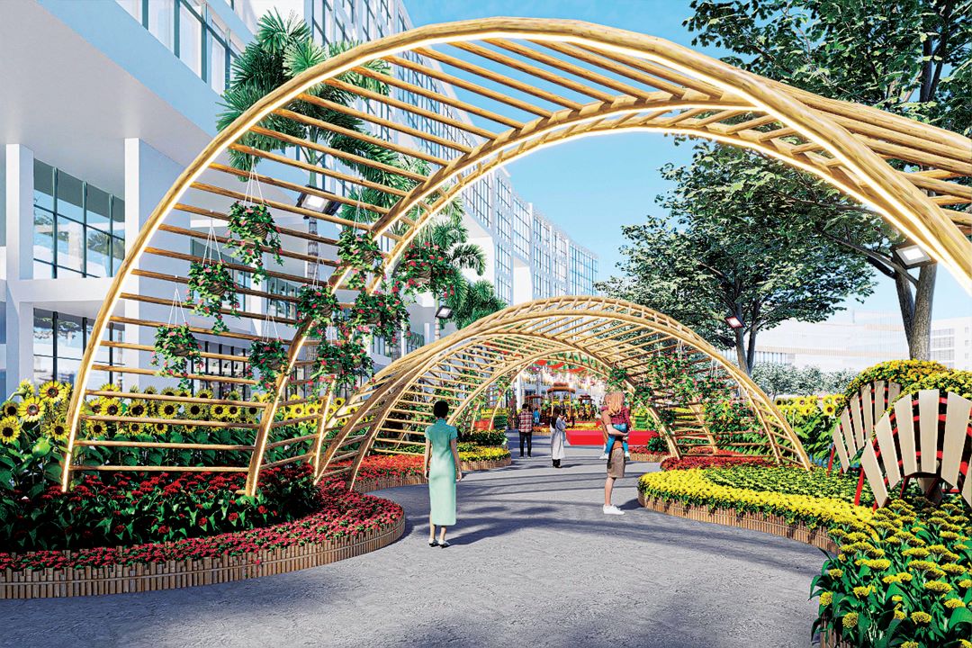 Hội hoa xuân Phú Mỹ Hưng 2026 với các tiểu cảnh trang trí và hoa kiểng có tổng diện tích khoảng 7.000 m2 được bố trí nối liền nhau, trải dài 700 mét dọc theo Hồ Bán Nguyệt tạo nên một Đường hoa đậm đà hương sắc Tết.