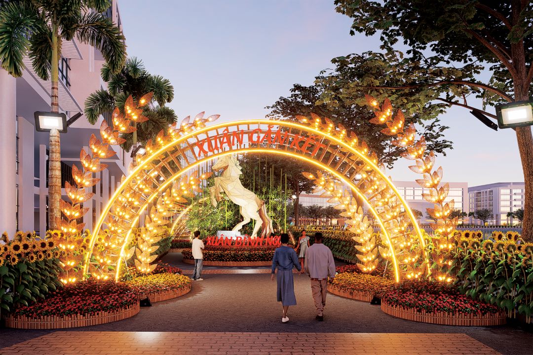Điểm nhấn nổi bật tiếp theo của Đường hoa Phú Mỹ Hưng 2026 là những tiểu cảnh về linh vật của năm Bính Ngọ. Ở đầu Đường hoa, linh vật ngựa được tạo hình bằng những khối đa giác hiện đại, với chiều cao 4,5m, thế vươn mình mạnh mẽ và dũng mãnh bên lũy tre làng vững chãi, thể hiện khát vọng vươn lên với những bước tiến nhảy vọt của kỷ nguyên vươn mình.