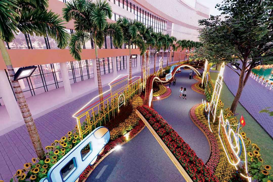 Chủ đề Xuân Gắn Kết được thể hiện đậm nét qua cụm tiểu cảnh Xuân Gắn Kết – Vững Bước Tương Lai nằm ở vị trí trung tâm của Đường hoa Phú Mỹ Hưng 2026. Thiết kế lấy cảm hứng từ tuyến Metro hiện đại, tượng trưng cho sự liên kết và phát triển mạnh mẽ của TP.HCM sau sáp nhập.