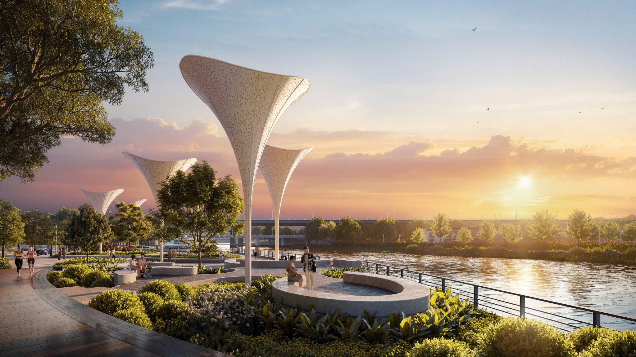 Bên cạnh đó, dự án dành khoảng 1 ha cho hệ cảnh quan ven sông, tích hợp các tiện ích như cầu dạo trên cao, vườn năng lượng, lâm viên tri thức, đồi ngắm hoàng hôn hay hồ cảnh quan. Không gian này không chỉ phục vụ nhu cầu thư giãn mà còn hướng đến kết nối cộng đồng cư dân.