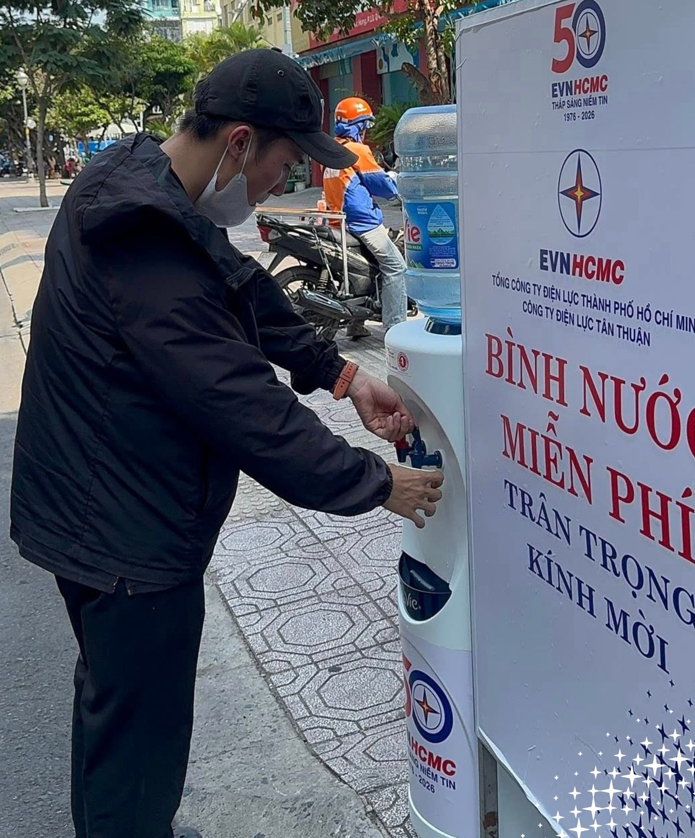 Ghi nhận tại khu vực của Công ty Điện lực Tân Thuận (đơn vị thuộc Tổng Công ty Điện lực TP. Hồ Chí Minh - EVNHCMC), các bình nước mát được đặt ở vị trí dễ tiếp cận, kèm ly dùng sẵn để người đi đường có thể dừng lại uống nước, nghỉ chân trong ít phút.