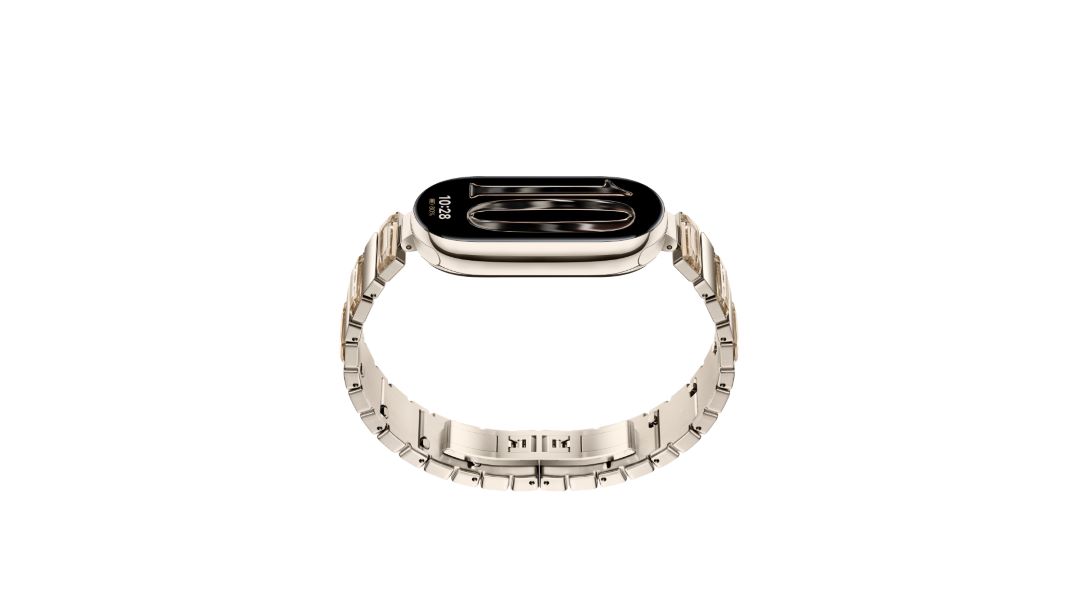 Xiaomi Smart Band 10 Glimmer Edition mang thiết kế sang trọng với khung hợp kim nhôm PVD ánh vàng kết hợp dây đeo đính pha lê, biến thiết bị công nghệ thành phụ kiện thời trang cao cấp và là điểm nhấn nổi bật trong Gold Collection.