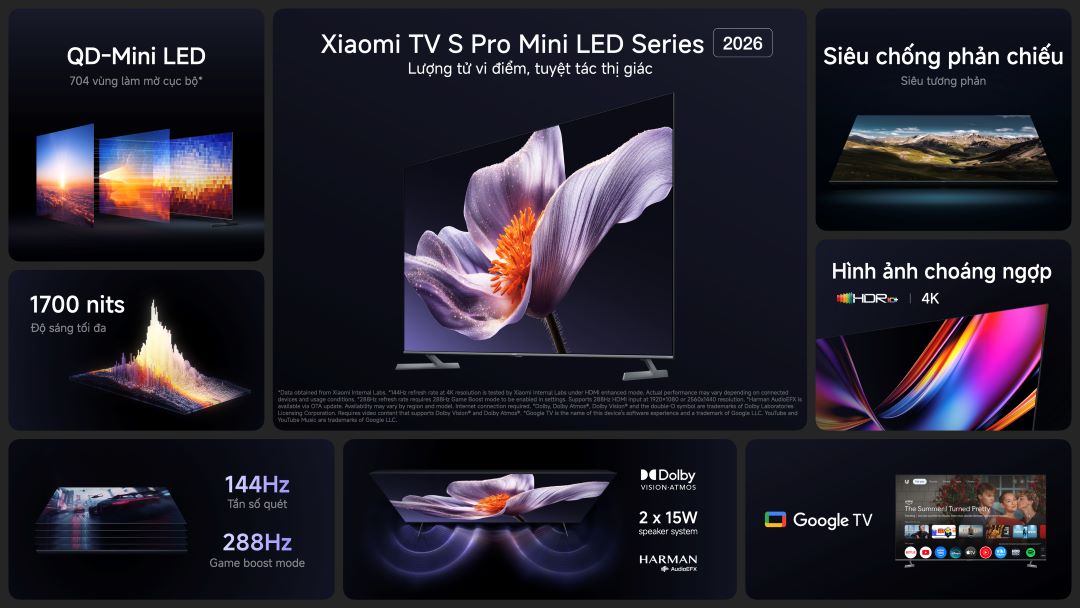 Song hành cùng robot hút bụi, Xiaomi TV S Pro Mini LED Series 2026 ra mắt tại thị trường Việt Nam với ba tùy chọn kích thước 55, 65 và 75 inch. Đây là dòng TV cao cấp ứng dụng công nghệ chấm lượng tử QD-Mini LED kết hợp tấm nền 4K, mang đến độ tương phản sâu, màu sắc sống động cùng độ sáng tối đa 1700 nits – tái hiện hình ảnh rực rỡ trong mọi bối cảnh.