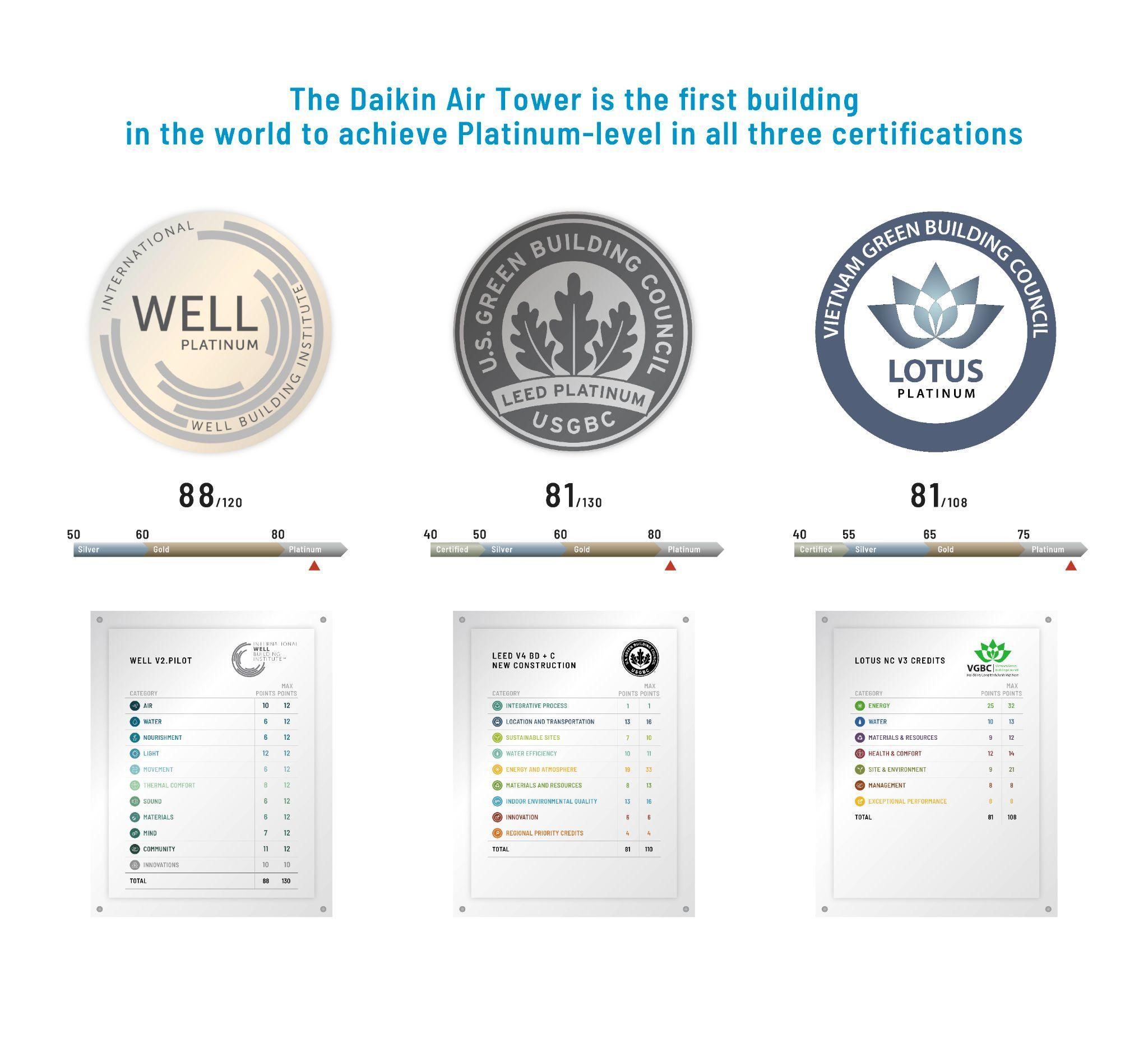Cụ thể, Daikin Air Tower đạt được LEED Platinum từ Hội đồng Công trình Xanh Hoa Kỳ (USGBC) chứng minh công trình được thiết kế, thi công và vận hành theo các tiêu chí tối ưu hóa hiệu suất năng lượng, sử dụng tài nguyên hiệu quả và giảm thiểu tác động môi trường.