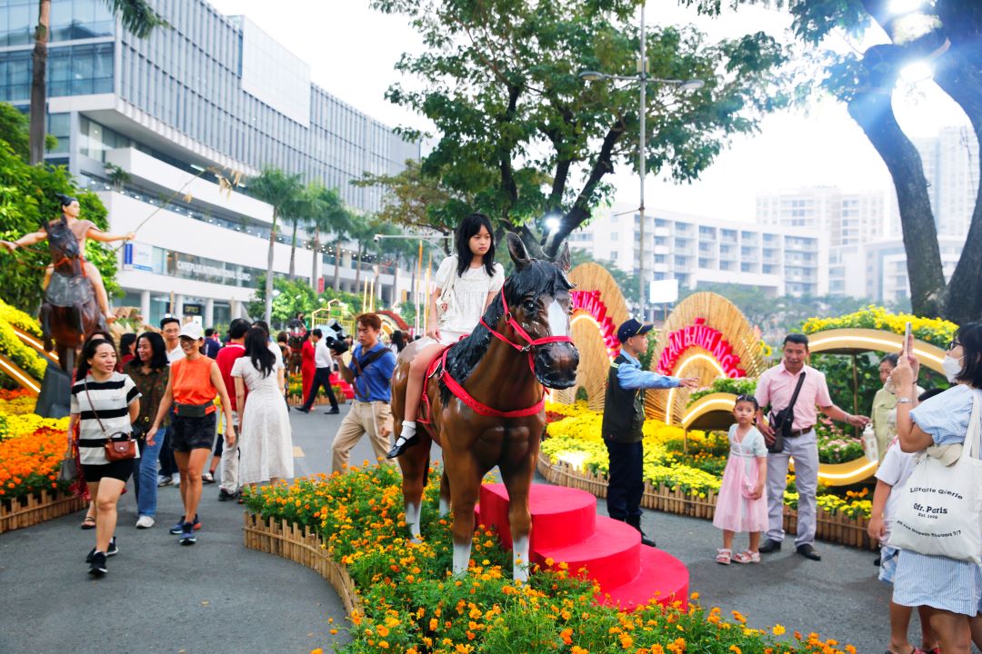 Linh vật năm Bính Ngọ được thể hiện quy mô và sáng tạo. Ngay lối vào là mô hình ngựa cao 4,5 mét với tạo hình đa giác hiện đại, tượng trưng cho tinh thần bứt phá. Các tiểu cảnh như “Xuân Khải Hoàn – Rạng Danh Non Sông”, “Bốn Mùa Hương Sắc” với những cỗ xe ngựa chở đầy hoa tươi, hay cụm “Xuân Mãnh Khởi – Mã Đáo Thành Công” gồm tám mô hình ngựa kích thước thật… đều gửi gắm thông điệp về sức sống và khát vọng vươn lên trong năm mới.