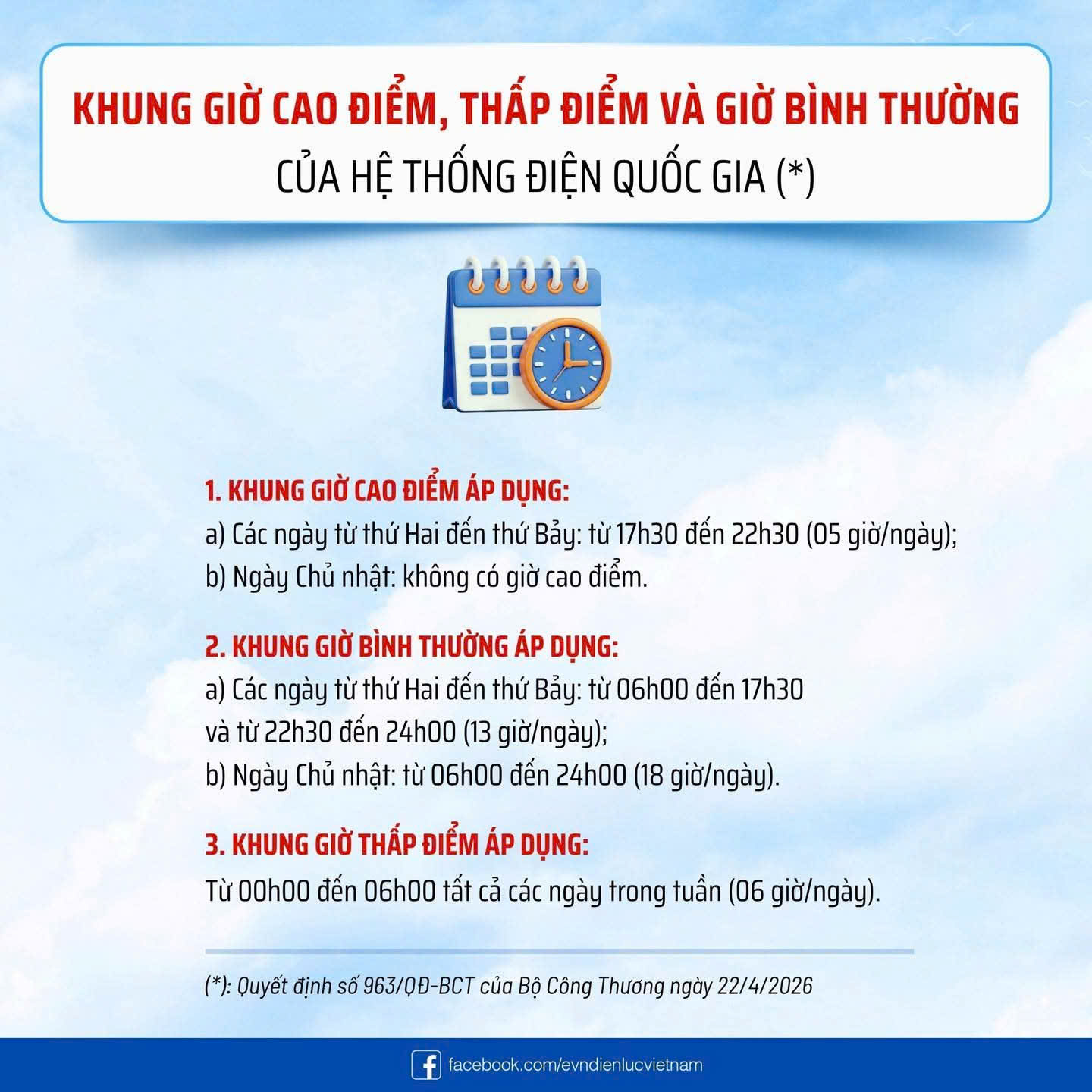 Theo Quyết định số 963/QĐ-BCT ngày 22/4/2026 của Bộ Công Thương, khung giờ sử dụng điện trong ngày được phân lại theo ba nhóm: cao điểm, bình thường và thấp điểm.