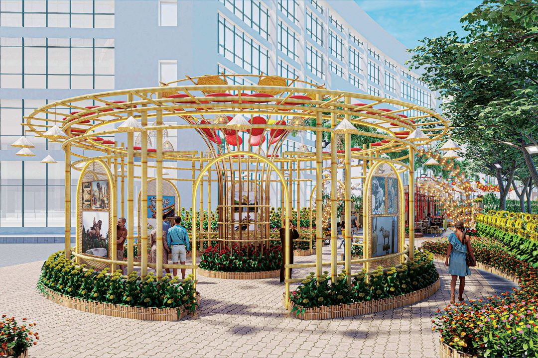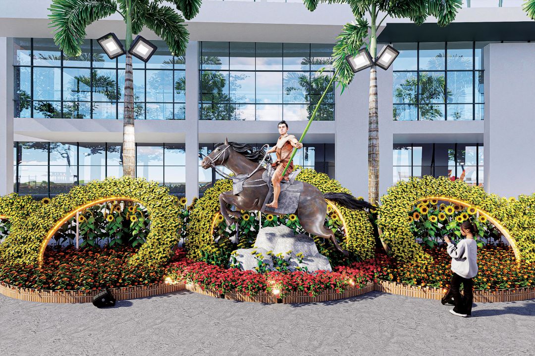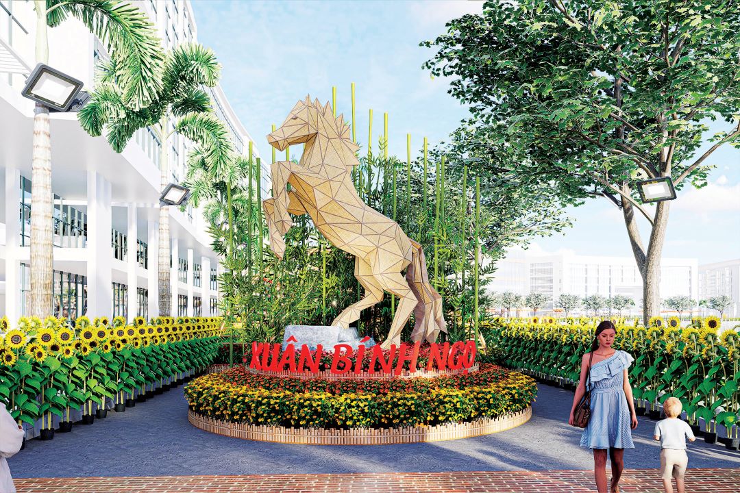 Điểm nhấn nổi bật tiếp theo của Đường hoa Phú Mỹ Hưng 2026 là những tiểu cảnh về linh vật của năm Bính Ngọ. Ở đầu Đường hoa, linh vật ngựa được tạo hình bằng những khối đa giác hiện đại, với chiều cao 4,5m, thế vươn mình mạnh mẽ và dũng mãnh bên lũy tre làng vững chãi, thể hiện khát vọng vươn lên với những bước tiến nhảy vọt của kỷ nguyên vươn mình.
