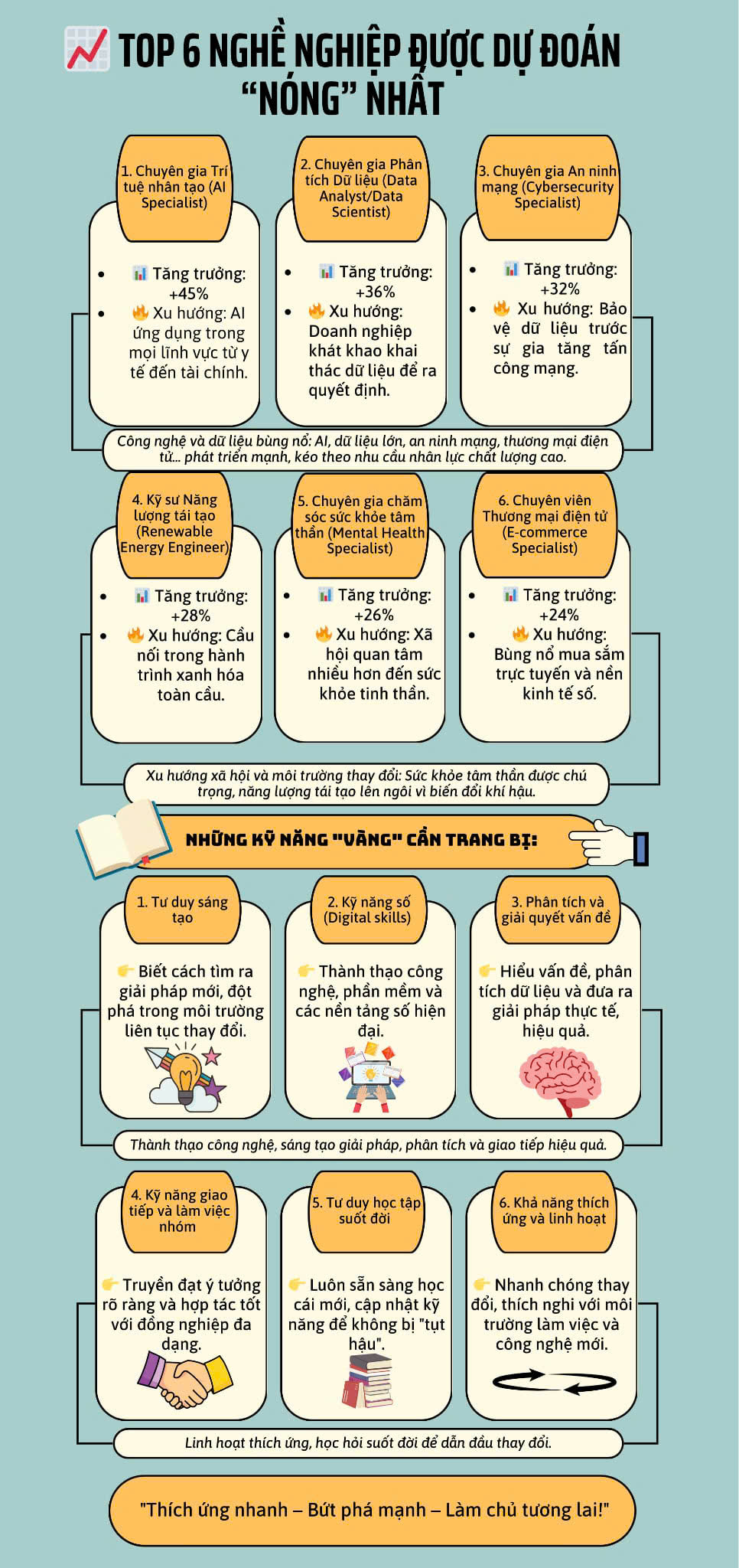 Trong bài viết này, tôi xin khái quát như sau: Công nghệ - vai trò trung tâm chuyển đổi của thị trường lao động và khả năng học hỏi, thích ứng sẽ là yếu tố quyết định cho sự thành công của mỗi người trong tương lai. Trong kỷ nguyên AI, sự sáng tạo là yếu tố quan trọng trong tất cả ngành nghề được đào tạo, AI có khả năng xử lý dữ liệu và tự động hóa nhiều nhiệm vụ. Tuy nhiên, khả năng sáng tạo, tư duy phản biện và tương tác xã hội… vẫn là những lĩnh vực mà con người giữ vai trò chủ chốt.